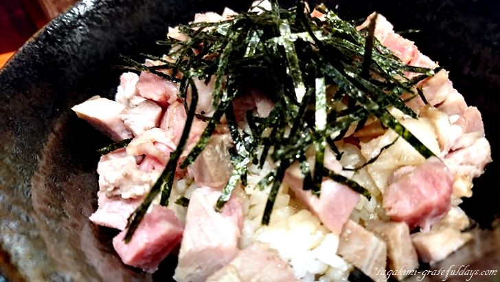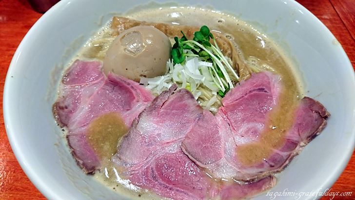 トッピングはレアチャーシュ3枚、そして半熟の味玉が一個入ってます。しかも味玉の半熟具合が最高でうまい。